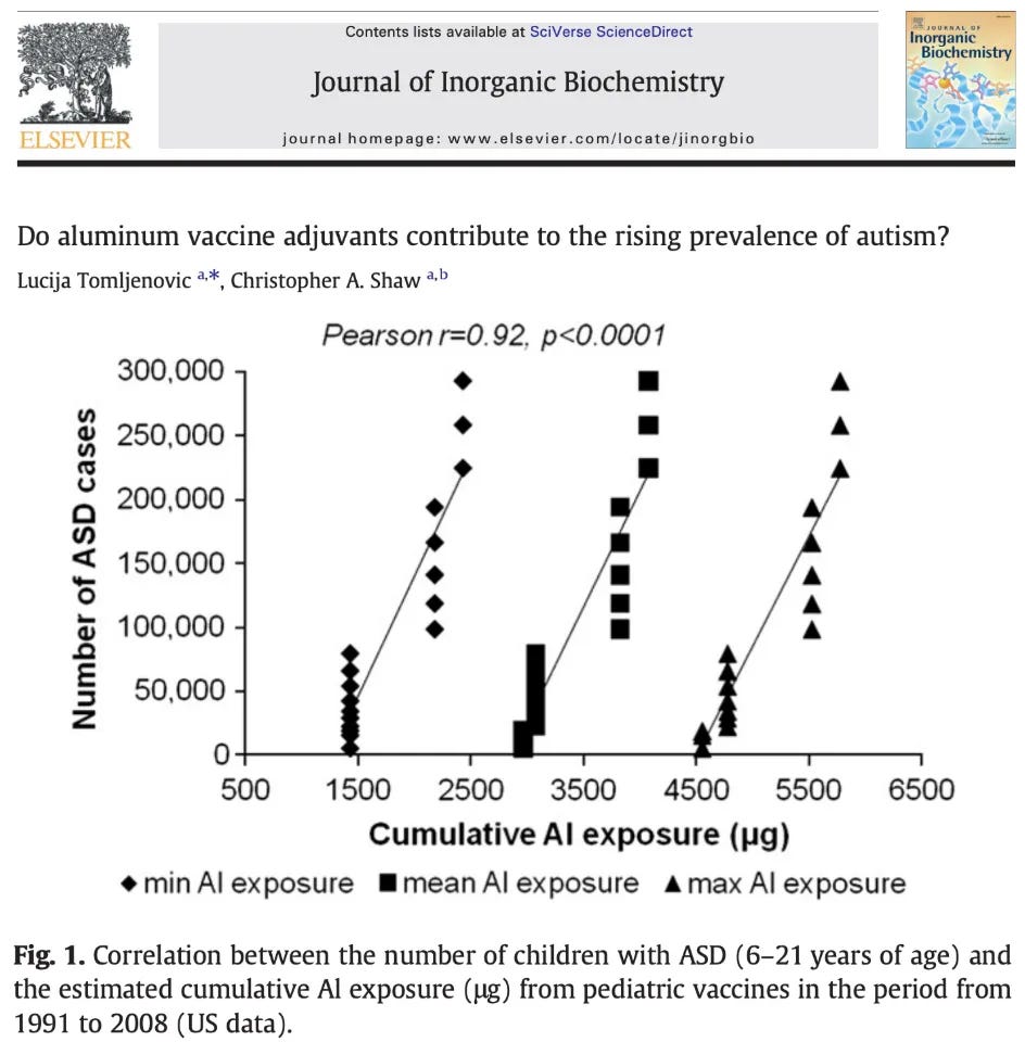 • Il lavoro di Tomljenovic & Shaw ha rilevato una “forte correlazione (r=0,92, p<0,0001)” tra l’aumento dell’esposizione agli adiuvanti di alluminio e l’incremento della prevalenza di ASD in due decenni, un risultato di estrema significatività statistica.