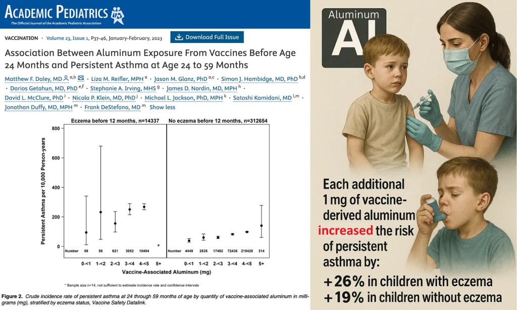Uno studio su larga scala, finanziato dal CDC (Centri per il controllo e la prevenzione delle malattie) e pubblicato sulla rivista Academic Pediatrics, ha analizzato i dati di 326.991 bambini. La ricerca ha calcolato l’esposizione cumulativa all’alluminio derivante dai vaccini prima dei 24 mesi di età, valutandone l’associazione con la diagnosi di asma persistente tra i 2 e i 5 anni.