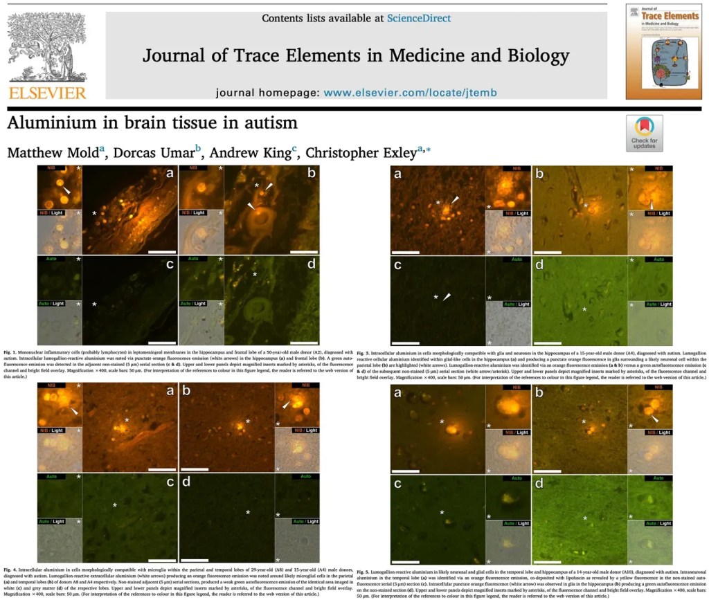 • Uno studio di Mold et al. ha riscontrato “livelli straordinariamente alti di alluminio nel cervello di persone autistiche”, depositati all’interno di neuroni, cellule immunitarie e nel tessuto cerebrale.