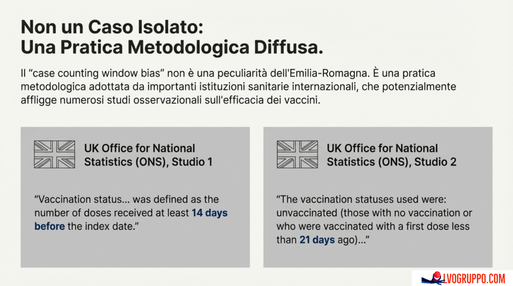 La pratica di utilizzare una finestra di esclusione post-vaccinale non è limitata all’Italia. Il testo riporta esempi dal Regno Unito, dove l’Office for National Statistics (ONS) ha adottato finestre temporali simili, di 14 o addirittura 21 giorni, per classificare lo stato vaccinale negli studi osservazionali. Questo suggerisce che il “case counting window bias” non è un problema locale, ma una potenziale fonte di distorsione metodologica comune a livello internazionale, che potrebbe aver influenzato la validità di numerosi studi sull’efficacia e la sicurezza dei vaccini.