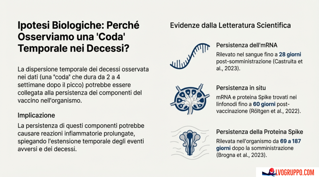 L’analisi ha evidenziato una “coda” temporale nell’incidenza dei decessi che si protrae per settimane dopo i picchi di vaccinazione, un fenomeno che può essere collegato a meccanismi biologici a medio e lungo termine. Studi scientifici hanno documentato la persistenza dei componenti vaccinali nell’organismo. Röltgen et al. hanno rilevato la presenza di mRNA e proteina Spike nei linfonodi ascellari fino a 60 giorni dopo la vaccinazione. L’estrema stabilità dell’mRNA sintetico è attribuita all’uso di N1-metilpseudouridina. Successivamente, Brogna et al. hanno dimostrato la persistenza della proteina Spike nel sangue per un periodo ancora più lungo, variabile tra 69 e 187 giorni. Questa persistenza può innescare reazioni infiammatorie croniche e processi autoimmuni, portando a eventi avversi fatali non immediati. Altri meccanismi patogeni discussi in letteratura includono il potenziale sviluppo di tolleranza immunitaria tramite l’aumento delle IgG4 e il ruolo pro-infiammatorio delle nanoparticelle lipidiche (LNP) stesse.