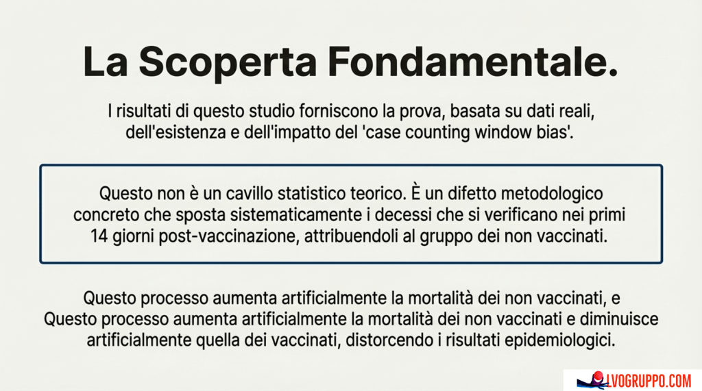 Lo studio sui dati dell’Emilia-Romagna fornisce una prova concreta, basata su dati reali, dell’esistenza del “case counting window bias”. Dimostra come un difetto metodologico possa distorcere in modo significativo le statistiche sulla mortalità, spostando i decessi che si verificano immediatamente dopo la vaccinazione dalla categoria dei vaccinati a quella dei non vaccinati.