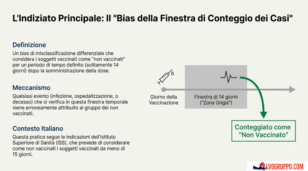 Al centro di questa analisi vi è il cosiddetto “case counting window bias” (bias della finestra di conteggio dei casi), un tipo specifico di bias di misclassificazione differenziale che agisce in modo asimmetrico sui gruppi messi a confronto. Questo bias si manifesta quando i soggetti vaccinati vengono considerati e classificati come “non vaccinati” per un determinato periodo di tempo immediatamente successivo alla somministrazione, tipicamente una finestra di 14 giorni. Tale pratica, seguita anche in Italia secondo le istruzioni dell’Istituto Superiore di Sanità (ISS), si basa sulla presunzione che sia necessario un intervallo temporale per lo sviluppo di una risposta immunitaria completa.