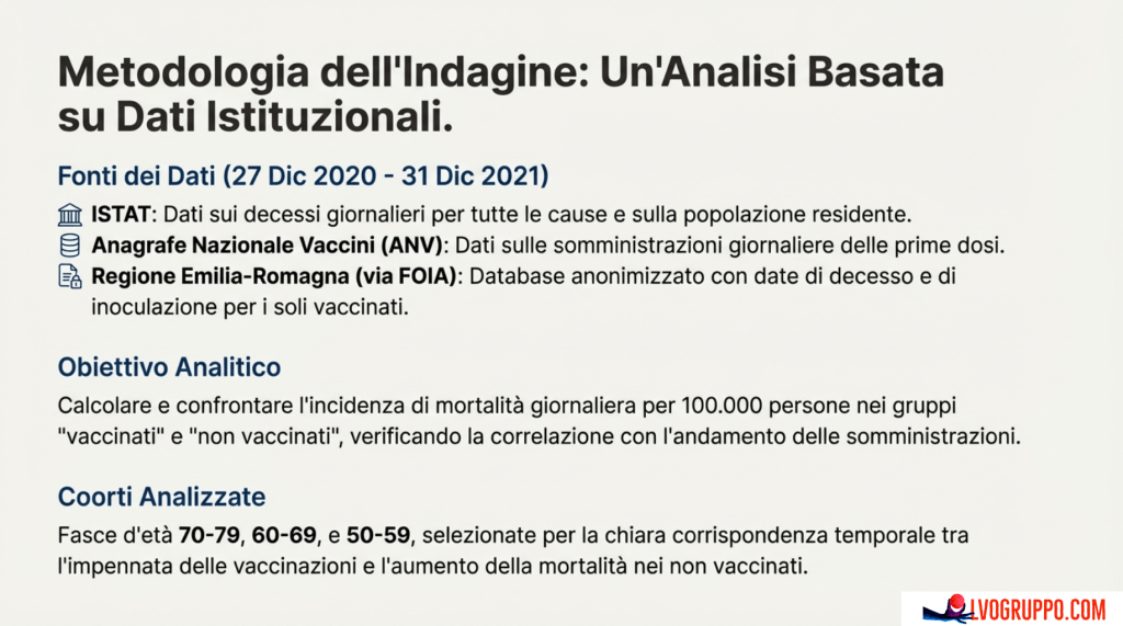 - Verificare l’ipotesi che tale bias sia la causa di una misattribuzione sistematica dei decessi per tutte le cause al gruppo dei non vaccinati, specialmente nei periodi di più intensa attività della campagna vaccinale.