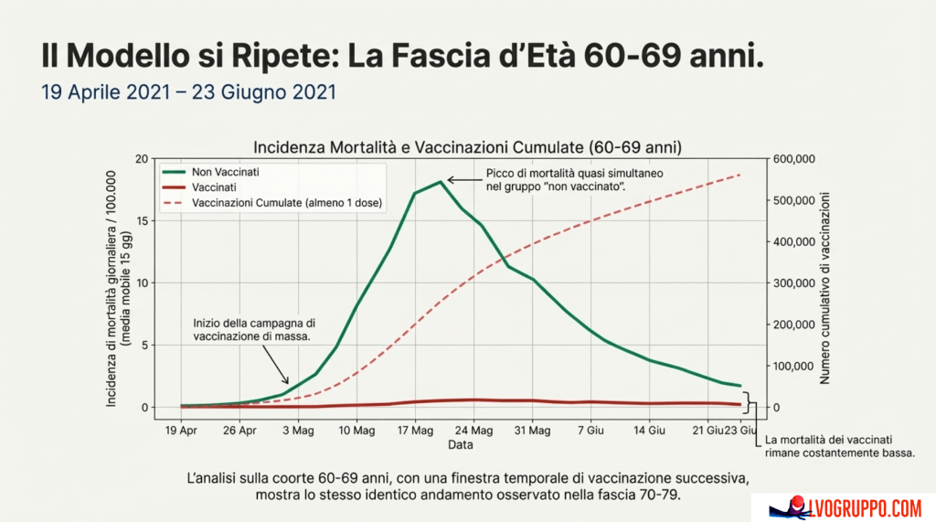 Per l’ultima fascia d’età analizzata, il modello di regressione ha prodotto un coefficiente R² = 0.290 (p < .0001), confermando una correlazione moderata ma statisticamente molto significativa. L’analisi temporale ha rivelato due picchi di somministrazione (prima metà di maggio e luglio) e un picco di mortalità tra i non vaccinati concentrato tra metà maggio e inizio giugno. È stato inoltre osservato che la “coda” temporale dell’eccesso di mortalità era più breve per questo gruppo rispetto alle fasce d’età più anziane.