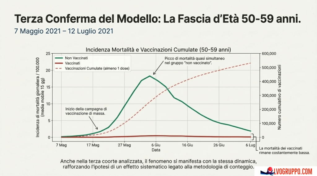 Sono state selezionate le fasce d’età 50-59, 60-69 e 70-79 anni per l’analisi approfondita. La scelta è stata motivata dall’osservazione preliminare di una chiara corrispondenza temporale tra l’intensificazione della campagna vaccinale per ciascun gruppo e un simultaneo aumento dell’incidenza di mortalità nella coorte dei non vaccinati. Per ciascuna fascia d’età, è stata definita una specifica finestra temporale per l’analisi statistica, coincidente con il periodo di massima somministrazione delle prime dosi.