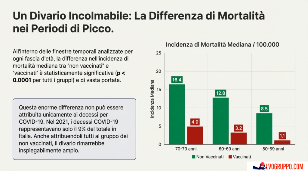 La differenza statisticamente significativa nella mortalità per tutte le cause tra i gruppi non può essere plausibilmente attribuita unicamente ai decessi per COVID-19. Nel 2021, in Italia, i decessi attribuiti al COVID-19 hanno rappresentato circa il 9% del totale. Anche ipotizzando, in uno scenario irrealistico, di attribuire tutti questi decessi al solo gruppo dei non vaccinati e di sottrarli dal conteggio, la differenza di mortalità osservata tra i due gruppi rimarrebbe comunque significativa. In assenza di bias, ci si aspetterebbe una differenza vicina allo zero per la mortalità non-COVID, specialmente in un intervallo di tempo così breve. La persistenza di una tale discrepanza rafforza l’ipotesi che la sua causa sia di natura metodologica, ovvero una sistematica riclassificazione dei decessi.