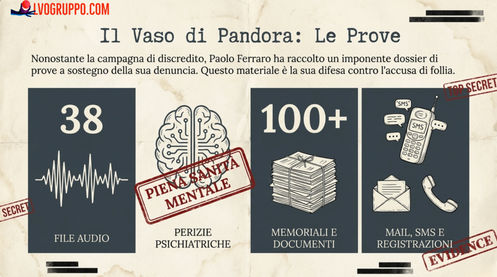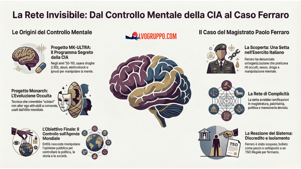 Quello che Paolo Ferraro scoprì superava ogni sua peggiore immaginazione. Le prove raccolte attraverso 38 file audio e video documentavano l’esistenza di una setta occulta con ramificazioni nei vertici delle Forze Armate, che operava utilizzando tecniche di controllo mentale in stile MK-ULTRA.