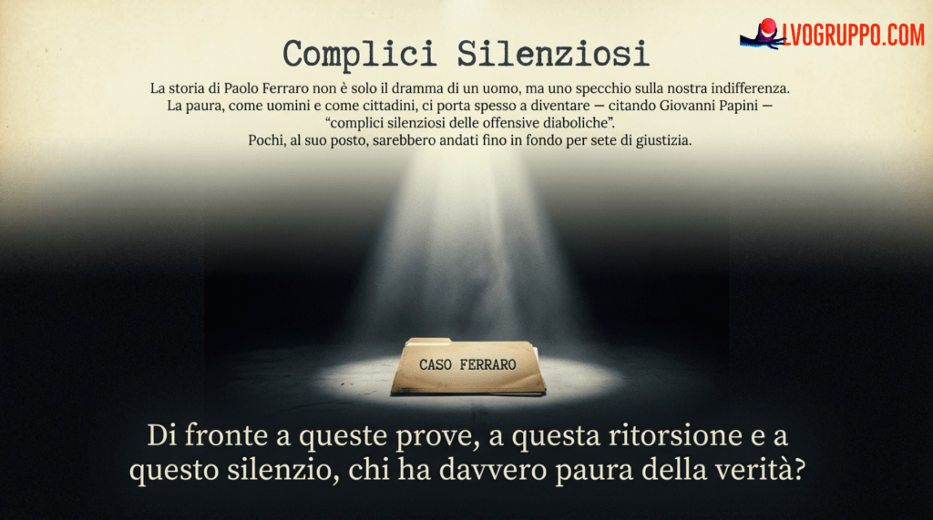 Ma sono anche i Paolo Ferraro di questo mondo, che scelgono di non diventare “complici silenziosi delle offensive diaboliche”, come ammoniva Giovanni Papini. Sono coloro che, di fronte alla banalità del male, scelgono di agire, anche quando sanno che il sistema si rivolterà contro di loro.