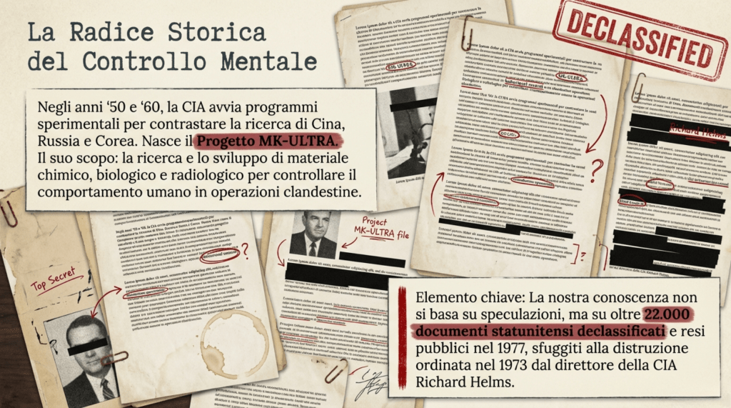 Fonti Storiche: – Documenti declassificati della CIA relativi al Progetto MK-ULTRA – Archivi del Senato americano sul controllo mentale – Documentazione storica del Sovrano Militare Ordine di Malta