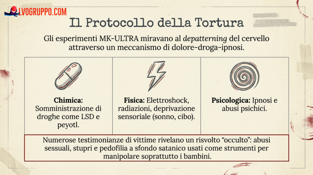 Traumi Ripetuti: Abusi fisici, sessuali e psicologici inflitti in modo sistematico per frammentare la personalità Alterazione Chimica: Uso di droghe psicotrope per indebolire le difese mentali e rendere la mente più manipolabile