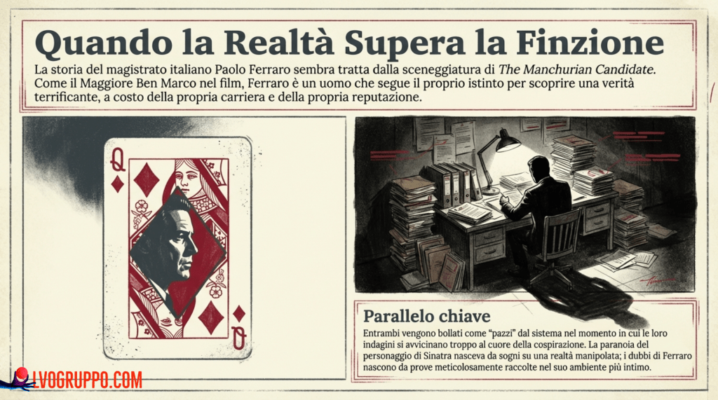 Questa domanda disperata echeggia nel capolavoro cinematografico The Manchurian Candidate (1962), pochi istanti prima che un vecchio giornalista venga eliminato per aver scoperto troppo. Sessant’anni dopo, nella Roma contemporanea, un magistrato italiano si sarebbe trovato a fare la stessa identica domanda, con conseguenze che sarebbero state altrettanto drammatiche.