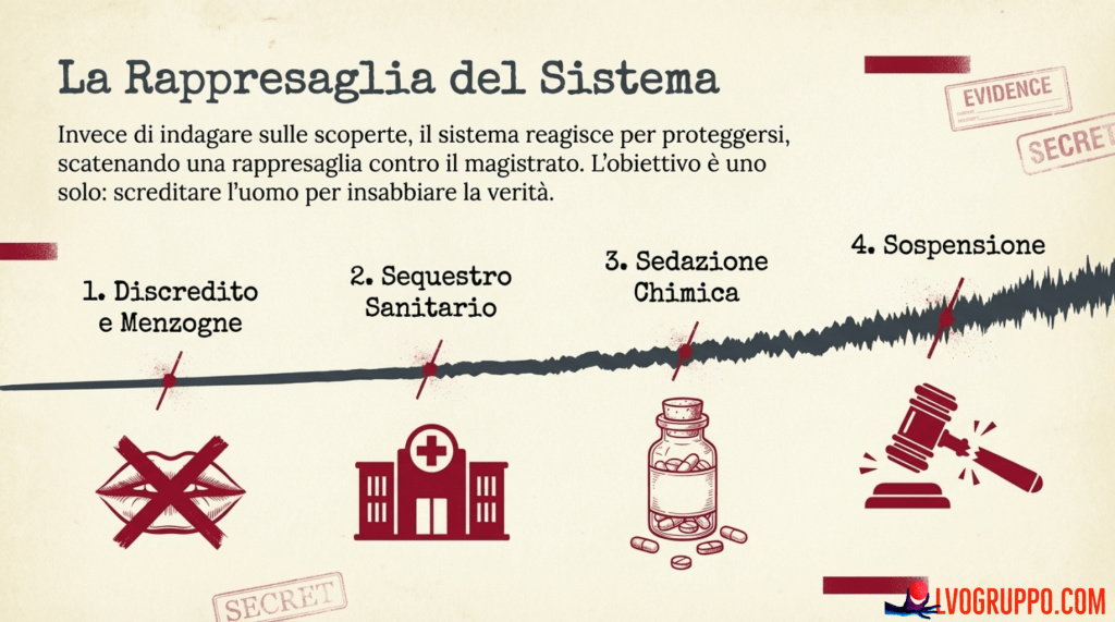 TSO illegali, psicofarmaci forzati, sospensioni arbitrarie, insabbiamento mediatico: tutti gli strumenti disponibili vennero utilizzati per distruggere la credibilità di Ferraro e seppellire la verità sotto una coltre di sospetto e follia. Era la dimostrazione pratica che esistono forze così potenti da poter utilizzare le stesse istituzioni che dovrebbero proteggere la giustizia per i propri scopi.