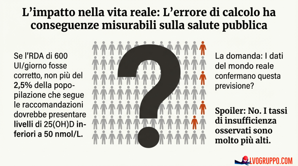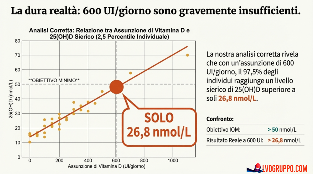 Con 600 UI al giorno, non il 97,5% delle persone raggiungeva 50 nmol/L. Il 97,5% delle persone raggiungeva appena 26,8 nmol/L—quasi la metà dell’obiettivo prefissato.