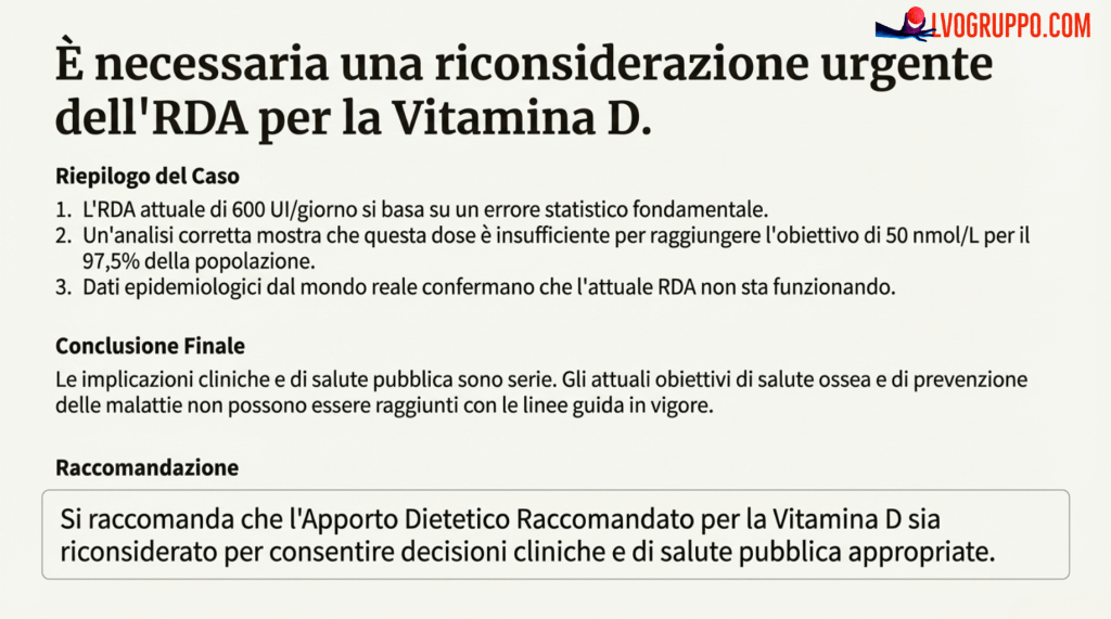 Non si trattava di un appello accademico, ma di una necessità pratica. Finché le linee guida rimanevano basate su un errore statistico, continuavano a esporre una porzione significativa della popolazione al rischio di carenza di vitamina D, con tutte le conseguenze per la salute delle ossa e la prevenzione delle malattie che ne derivavano.