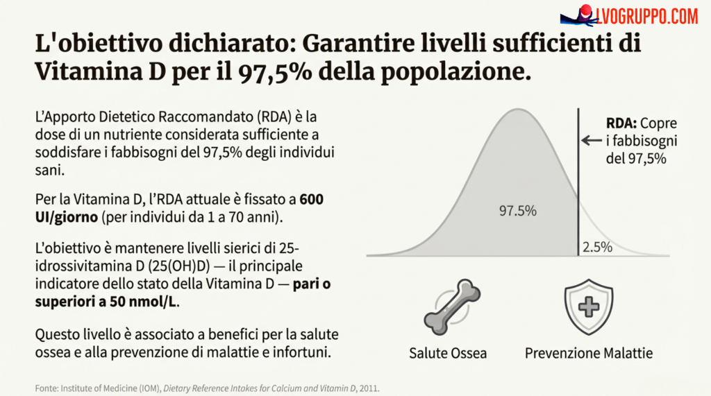 La Dose Dietetica Raccomandata (RDA) per la vitamina D, stabilita dall’Institute of Medicine, aveva un obiettivo chiaro e nobile: garantire che il 97,5% delle persone sane raggiungesse un livello di 25-idrossivitamina D di almeno 50 nmol/L nel sangue.