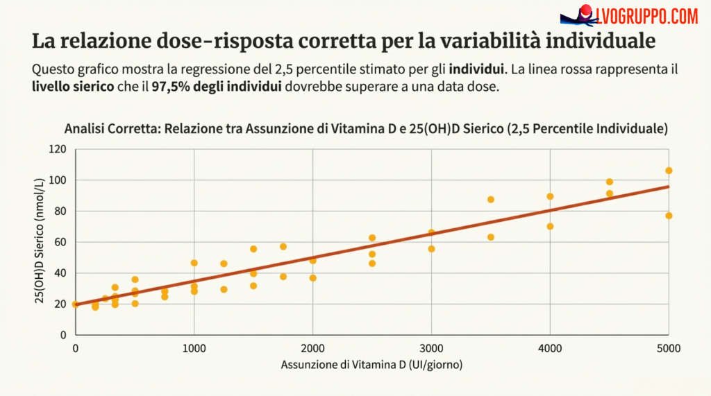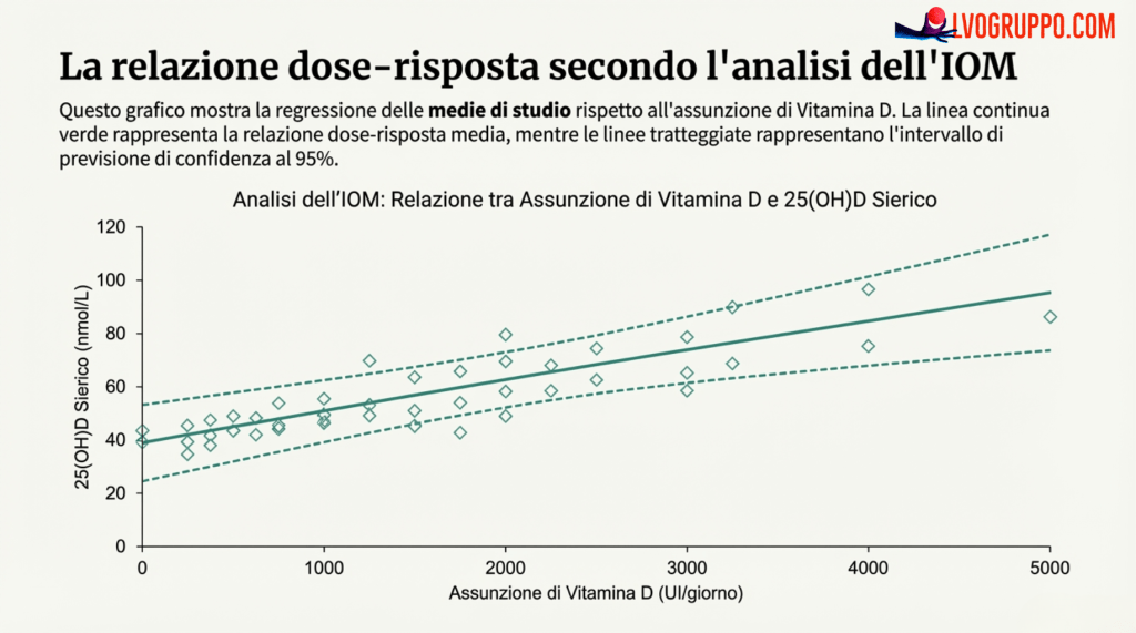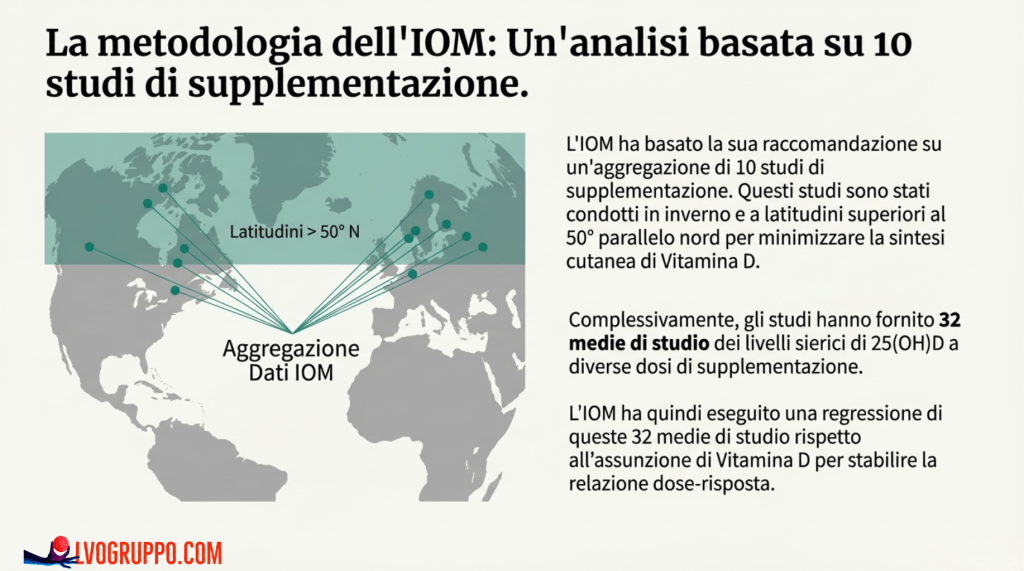 L’IOM aveva condotto un’analisi rigorosa, esaminando 10 studi clinici condotti durante i mesi invernali in località a latitudini elevate—condizioni che minimizzavano l’influenza della sintesi cutanea di vitamina D attraverso l’esposizione solare. Da questi studi erano emerse 32 “medie di gruppo”, punti-dati che rappresentavano i livelli medi raggiunti da diversi gruppi di persone sottoposte a dosaggi variabili di integrazione.