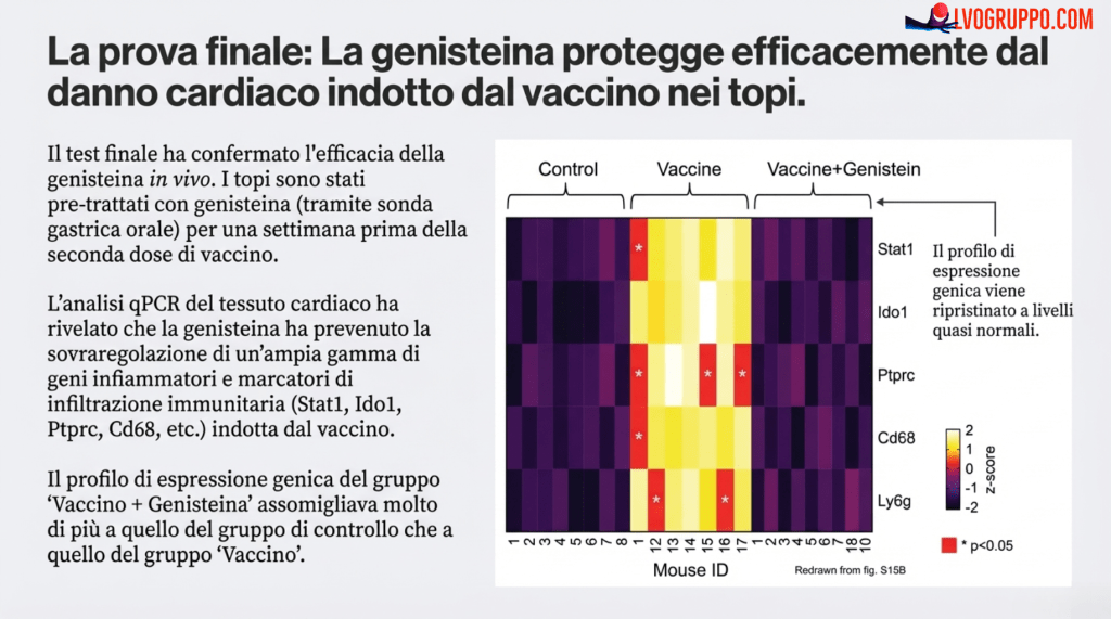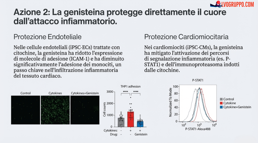 I risultati hanno mostrato che la Genisteina esercita una potente duplice azione, intervenendo sul problema con un attacco su due fronti. Agisce sia alla sorgente del problema, calmando le cellule immunitarie iperattive, sia sul bersaglio, proteggendo direttamente il tessuto cardiaco. In particolare, è stato dimostrato che la Genisteina: