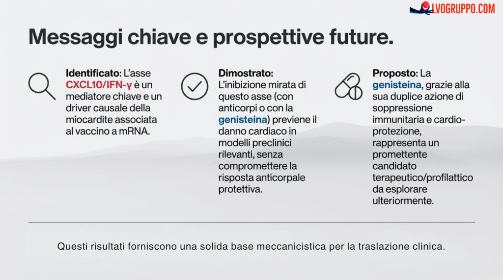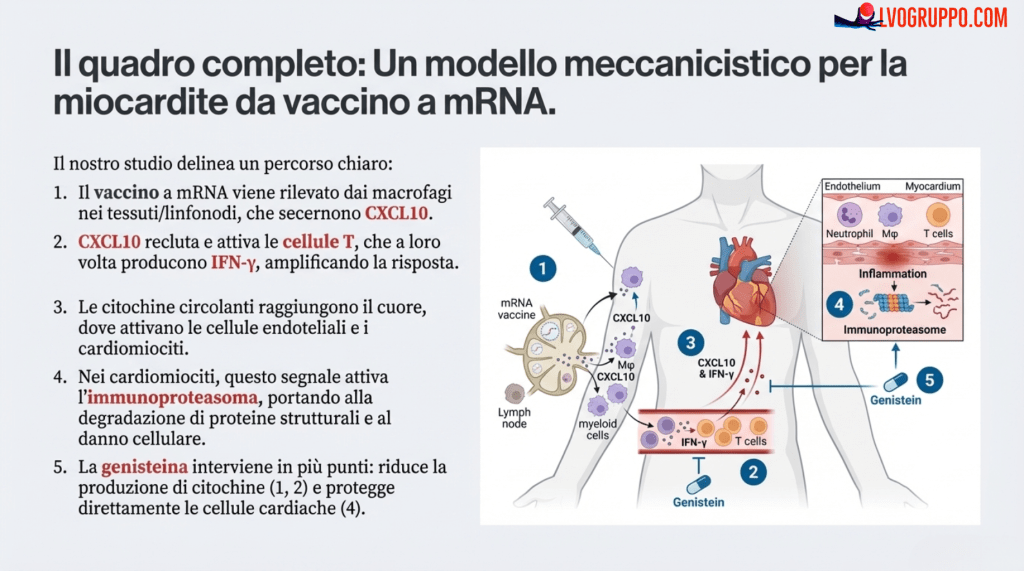 Questa ricerca trasforma un’area di incertezza in una narrazione scientifica chiara e definita. Ora sappiamo che il raro evento di miocardite post-vaccino a mRNA è il risultato di una catena di eventi ben precisa: i macrofagi, stimolati dal vaccino, producono CXCL10; questa richiama i linfociti T, che rilasciano IFN-γ; infine, queste due citochine attivano l’immunoproteasoma nelle cellule cardiache, causando un danno.