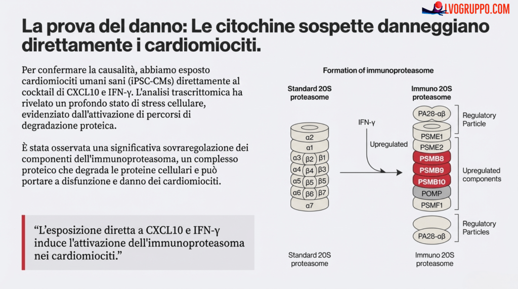 Questo meccanismo è noto come immunoproteasoma. Per comprenderlo, pensiamo al proteasoma standard come al “centro di riciclaggio” di una cellula, che scompone le proteine vecchie o danneggiate. L’immunoproteasoma è una sua versione ad alta potenza, che si attiva durante una forte risposta immunitaria. In questo caso, le citochine lo spingono in un tale stato di iperattività che inizia a distruggere anche le proteine strutturali essenziali, indebolendo di fatto il muscolo cardiaco.