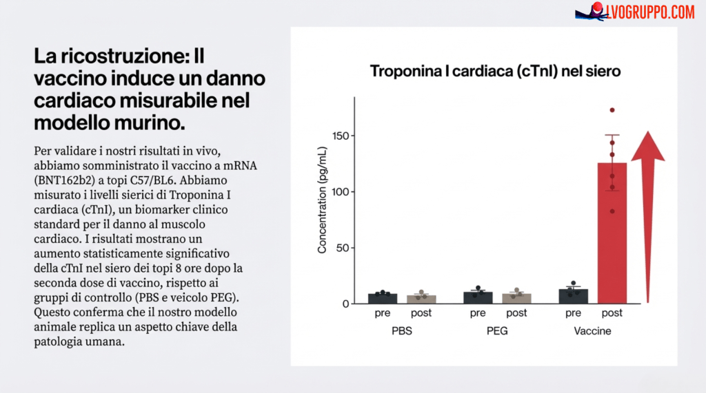 Sebbene i saggi in vitro abbiano dimostrato una disfunzione a livello cellulare, non potevano catturare la complessità di una risposta immunitaria sistemica integrata o l’impatto sul tessuto cardiaco nel contesto di un organismo completo. Pertanto, la traslazione di queste scoperte in modelli murini in vivo è stata un passo indispensabile per validarne la rilevanza fisiopatologica.