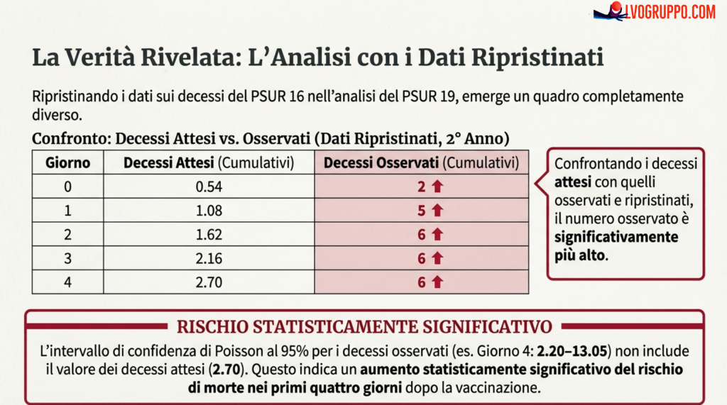 Qualunque sia la spiegazione, il risultato è che quando i decessi riportati nel PSUR 16 vengono reintegrati nell’analisi del PSUR 19, il quadro cambia drasticamente. Utilizzando i dati originali del PSUR 16 (che riportano più decessi), il numero di decessi osservati nel secondo anno di vita nei primi quattro giorni dopo la vaccinazione risulta significativamente superiore ai decessi attesi, con un intervallo di confidenza Poisson del 95% che non include il valore zero. In altre parole, l’apparente assenza di rischio nel PSUR 19 potrebbe essere un artefatto di dati rimossi, non una rappresentazione accurata della realtà.