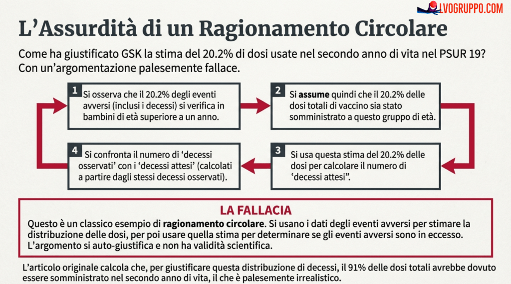 Il problema metodologico più grave, tuttavia, è un altro. Il PSUR 19 assume che il 20,2% delle dosi sia stato utilizzato nel secondo anno di vita — e giustifica questa assunzione affermando che il 20,2% degli eventi avversi (inclusi i decessi) si è verificato in bambini sopra l’anno di età. In altre parole, deduce la distribuzione delle dosi dalla distribuzione degli eventi avversi osservati.