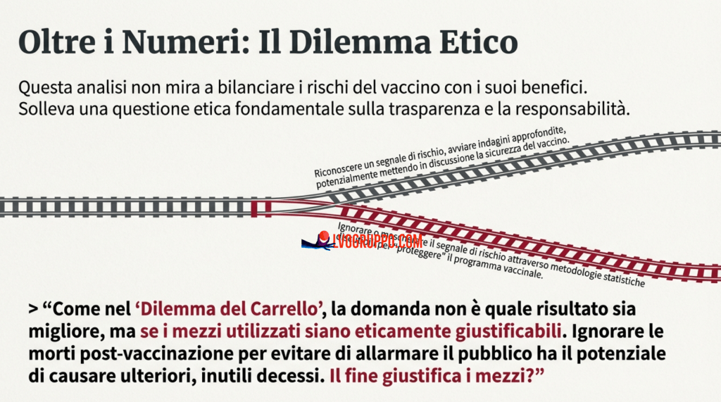 Qual è la rilevanza di questo dilemma per i vaccini? Gli autori lo utilizzano per articolare un principio fondamentale: il fine non giustifica i mezzi. Se i dati mostrano un aumento del rischio di morte nei giorni successivi alla vaccinazione, questo rischio deve essere riconosciuto, comunicato e investigato — non minimizzato o ignorato per paura di minare la fiducia nei vaccini o di rallentare i programmi di immunizzazione.
