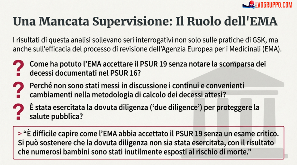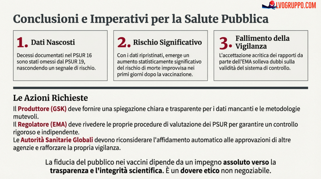 Le raccomandazioni che emergono da questa analisi sono chiare. GSK deve spiegare le discrepanze tra i dati riportati nei diversi PSUR e fornire una giustificazione metodologica per i cambiamenti nei calcoli dei decessi attesi. L’EMA deve rivedere le procedure di valutazione delle affermazioni nei PSUR e spiegare come sia stato possibile accettare il PSUR 19 senza notare le anomalie documentate. Il DCGI dell’India e le autorità regolatorie di altri paesi che si affidano alle valutazioni dell’EMA devono essere informati delle criticità emerse e riconsiderare la prassi di accettazione automatica. I PSUR devono diventare documenti accessibili al pubblico, o quantomeno ai professionisti sanitari che hanno il compito di informare i pazienti.
