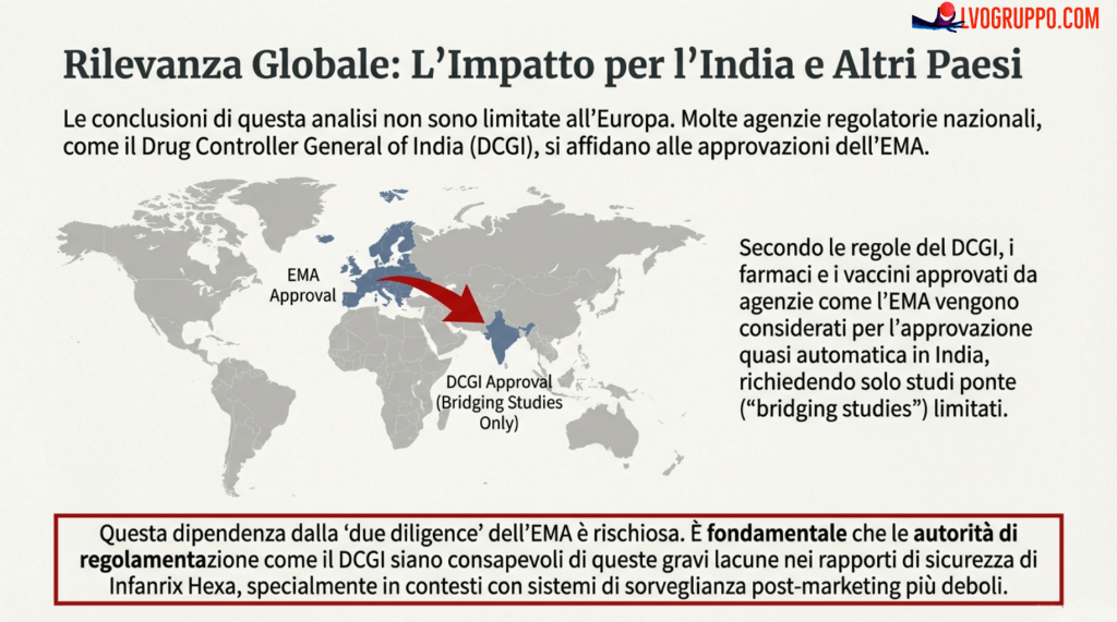 Lo studio di Puliyel e Sathyamala non è rilevante solo per l’Europa. Gli autori sottolineano esplicitamente le implicazioni per l’India, dove il Controller Generale dei Farmaci (DCGI) — l’autorità regolatoria indiana — ha una prassi di accettazione semi-automatica dei farmaci e vaccini già approvati dalle agenzie regolatorie di USA, UK, Canada, Giappone, Australia e Unione Europea. Sono richiesti solo studi di bridging per valutare l’impatto dei fattori etnici su efficacia, sicurezza, dosaggio e regimi posologici.