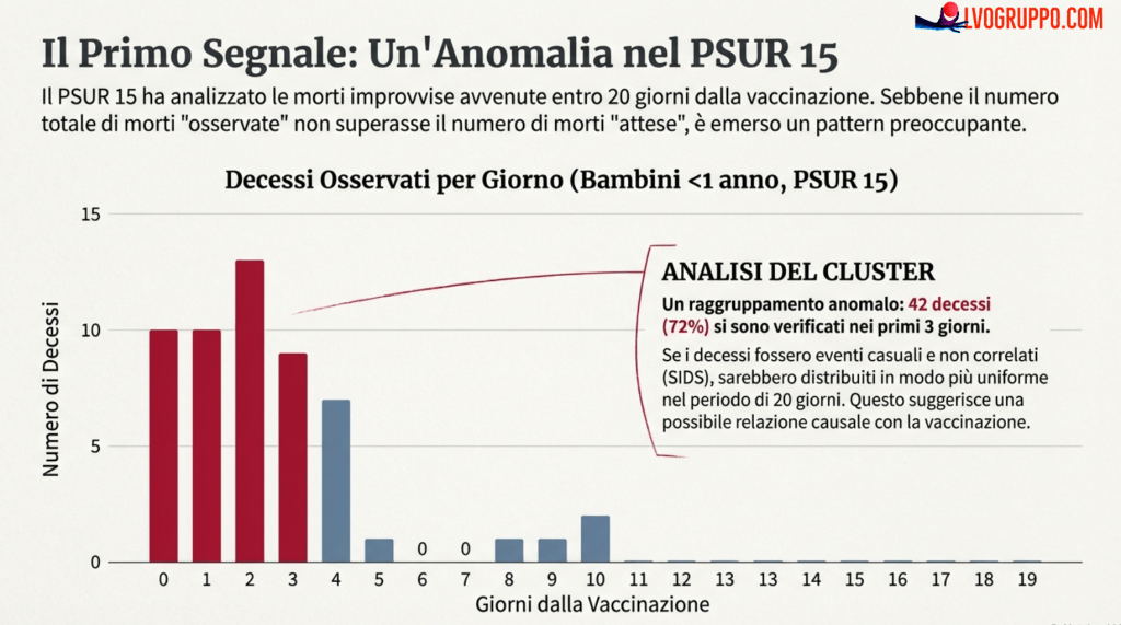 Ciò che i genitori europei non seppero mai — e che solo oggi emerge con chiarezza — è che i rapporti periodici di sicurezza confidenziali sottoposti da GSK all’Agenzia Europea dei Medicinali (EMA) contenevano evidenze di un pattern inquietante anche per Infanrix hexa: un addensamento anomalo di morti nei giorni immediatamente successivi alla vaccinazione, concentramento che non poteva essere spiegato con la semplice coincidenza statistica.