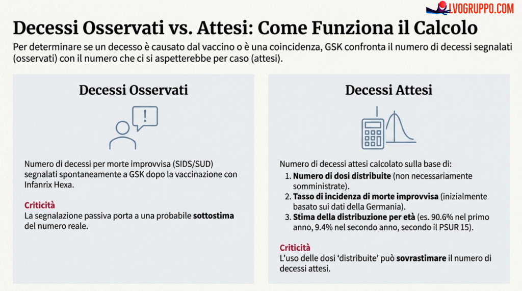 Questa spiegazione, per quanto plausibile in linea di principio, solleva diverse obiezioni critiche. La prima riguarda la natura stessa della sorveglianza post-marketing. GSK ammette implicitamente che non esisteva un sistema di sorveglianza attiva nel periodo post-vaccinazione: i decessi venivano inclusi solo se segnalati spontaneamente. Questo significa che il numero di “decessi osservati” riportato nei PSUR è inevitabilmente una sottostima del numero reale di decessi verificatisi dopo la vaccinazione. Se il sistema di raccolta dati è difettoso, come possono i risultati dell’analisi essere considerati affidabili?