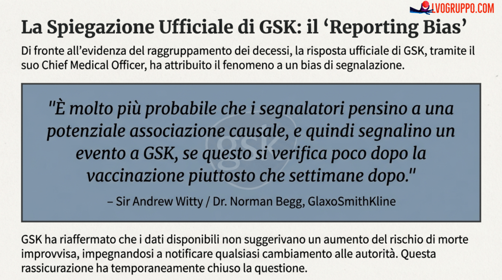 Di fronte alle evidenze di clustering dei decessi, la risposta di GlaxoSmithKline merita un’attenta analisi critica. Il Chief Medical Officer dell’azienda, dottor Norman Begg, rispose per conto del CEO Sir Andrew Witty con una lettera che, pur non negando i dati, proponeva una spiegazione alternativa: i giornalisti e i genitori che riportano gli eventi avversi sono molto più propensi a pensare a una possibile associazione causale e a segnalare un evento a GSK se questo si verifica poco dopo la vaccinazione piuttosto che se si verifica settimane dopo.