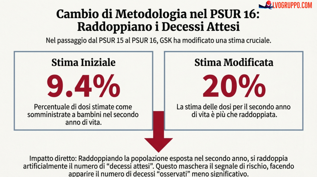 Nel PSUR 16, tuttavia, la stima cambia drammaticamente: la percentuale di dosi utilizzate nel secondo anno passa dal 9,4% al 20%. Questo raddoppio ha conseguenze significative sui calcoli dei decessi attesi: se raddoppia il numero di dosi somministrate nel secondo anno, raddoppia anche il numero di decessi attesi in quel periodo. E se raddoppiano i decessi attesi, il rapporto osservato/atteso diminuisce, rendendo meno evidente qualsiasi potenziale aumento del rischio.