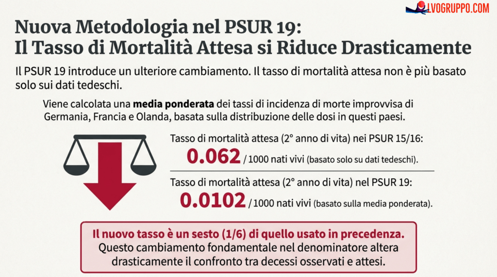 Ma su cosa si basa questo raddoppio? Il PSUR 19 usa un approccio ancora diverso: calcola una media ponderata dei tassi di mortalità per morte improvvisa in Germania, Francia e Olanda, dove le dosi sono distribuite. Se il 60% delle dosi sono distribuite in Germania in un dato anno, il tasso di mortalità tedesco riceve un peso del 60%; se il 30% in Francia, il peso è del 30%, e così via. Il tasso complessivo risultante per il secondo anno di vita è 0,0102 per 1000 nati vivi — un sesto del valore usato nei PSUR 15 e 16 (0,062 per 1000), che si basavano esclusivamente sui dati tedeschi.