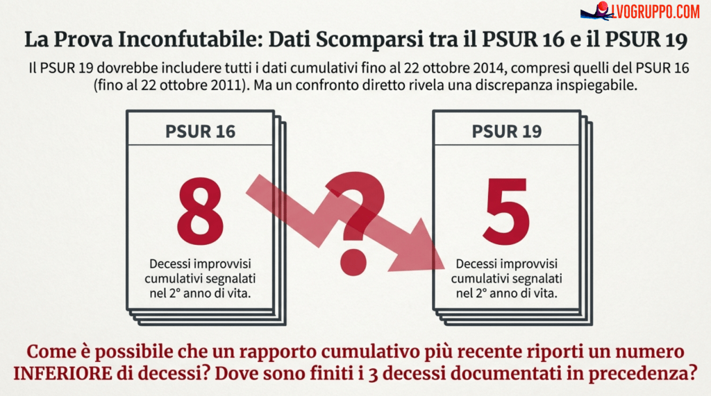 La seconda ipotesi, più inquietante, è che i criteri di inclusione siano stati modificati tra i due rapporti. Il PSUR 19 esclude esplicitamente i casi in cui l’età del bambino al momento della vaccinazione non era nota, il tempo intercorso tra vaccinazione e morte non era registrato, o il tempo superava i 19 giorni. Se queste esclusioni fossero state applicate retroattivamente ai dati del PSUR 16, potrebbero spiegare alcune delle differenze. Ma non spiegano tutto: il PSUR 16, a sua volta, documentava l’età e il tempo intercorso per ciascun decesso.