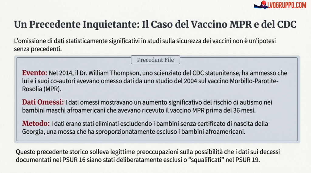 La terza ipotesi, che gli autori sollevano con cautela ma con crescente preoccupazione, è che i dati siano stati in qualche modo modificati o selezionati per produrre un quadro più favorevole. Gli autori citano un precedente significativo: nel 2014, William Thompson, ricercatore presso i Centers for Disease Control and Prevention (CDC) americano, ammise che lui e i suoi coautori avevano omesso informazioni statisticamente significative in un articolo sul rapporto tra vaccino MPR (morbillo, parotite, rosolia) e autismo. In quel caso, i dati erano stati letteralmente eliminati dall’analisi per presentare conclusioni diverse. Non è irragionevole chiedersi se dinamiche simili possano essere avvenute nei rapporti GSK.