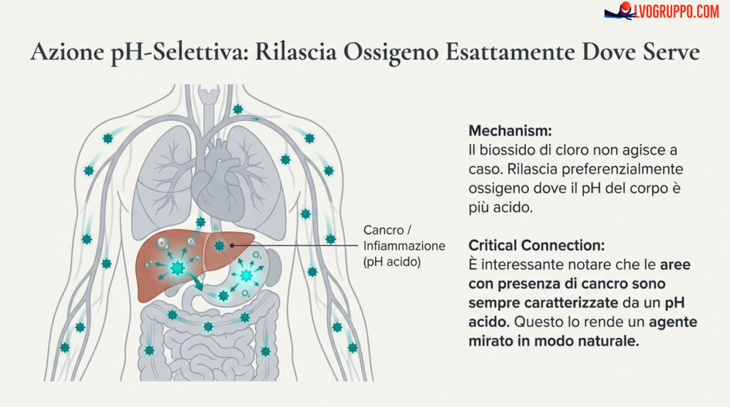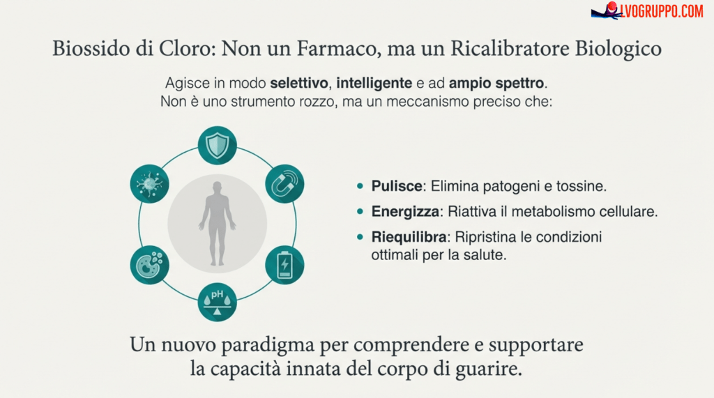 | Biossido di Cloro | 0,95 Volt | Ossidante selettivo: troppo debole per sottrarre elettroni alle cellule sane. |