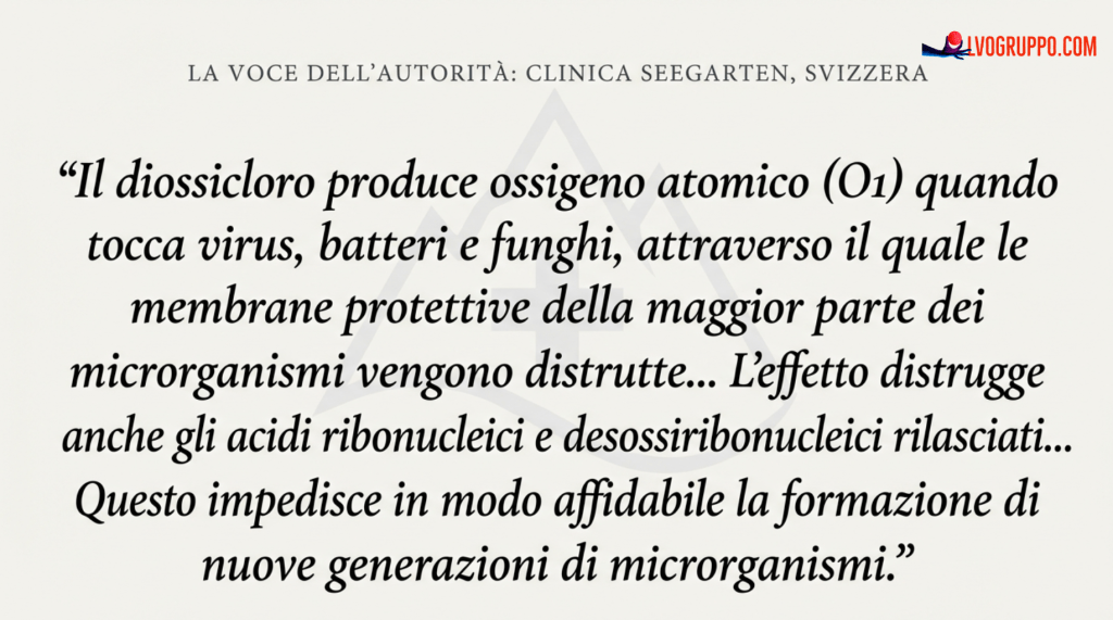 “Dioxychlor produce ossigeno atomico (O₁) quando tocca virus, batteri e funghi, per cui le membrane protettive della maggior parte dei microrganismi vengono scomposte […]. L’effetto del dioxychlor distrugge anche gli acidi ribonucleici e deossiribonucleici rilasciati, in particolare le loro basi nucleiche di guanina. Questo impedisce in modo affidabile la formazione di nuove generazioni di microrganismi.”