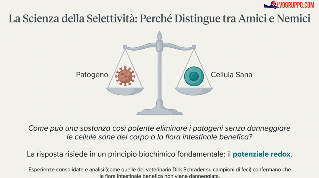 La conclusione chiave: Il biossido di cloro non attacca le cellule del corpo o i batteri “buoni” grazie al suo potenziale redox inferiore rispetto a quello delle strutture biologiche sane. È un ossidante selettivo per natura.