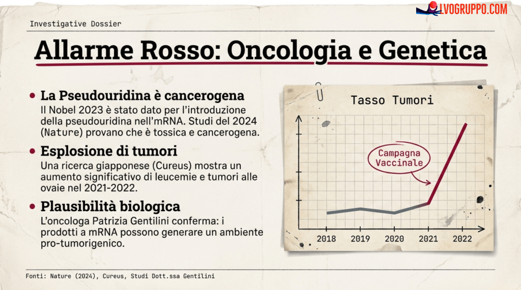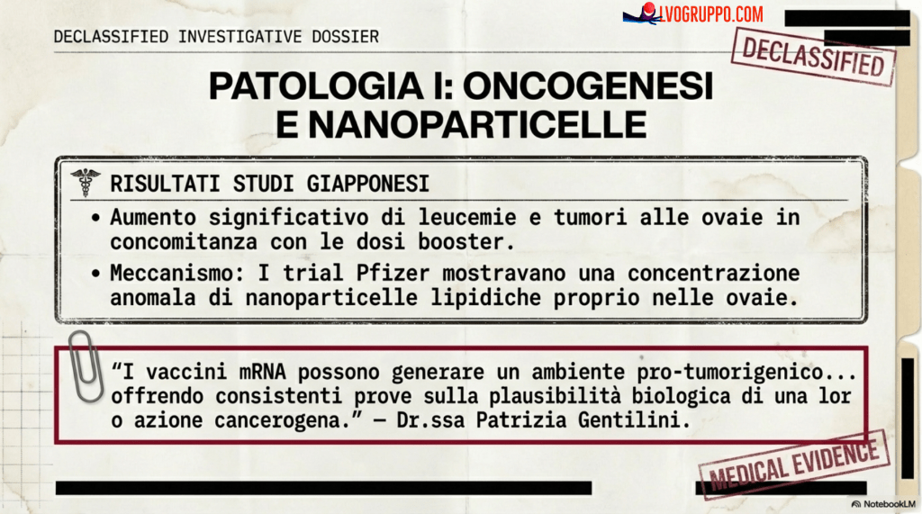 | Oncogenesi | Incremento significativo di leucemie e tumori ovarici (Cureus 2024, Gentilini 2024). Concentrazione di mRNA nelle ovaie confermata dai trial Pfizer. |