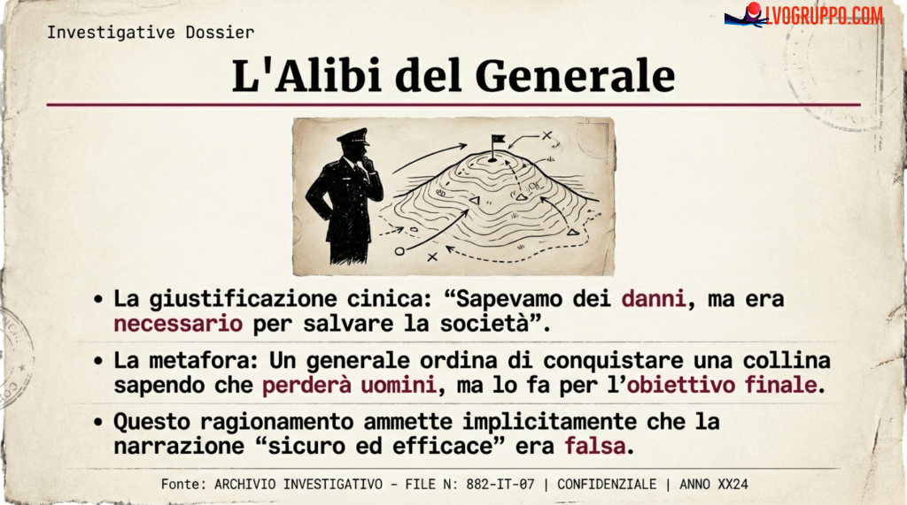 3. Esistenza di Cure Alternative: La “collina” poteva essere conquistata senza l’assalto frontale. L’ostruzionismo verso le cure precoci efficaci (Ivermectina, corticosteroidi precoci, protocolli domiciliari) ha reso i sacrifici umani del tutto evitabili. Il generale che rifiuta la via diplomatica per imporre l’assalto sanguinoso è colpevole delle morti evitabili.