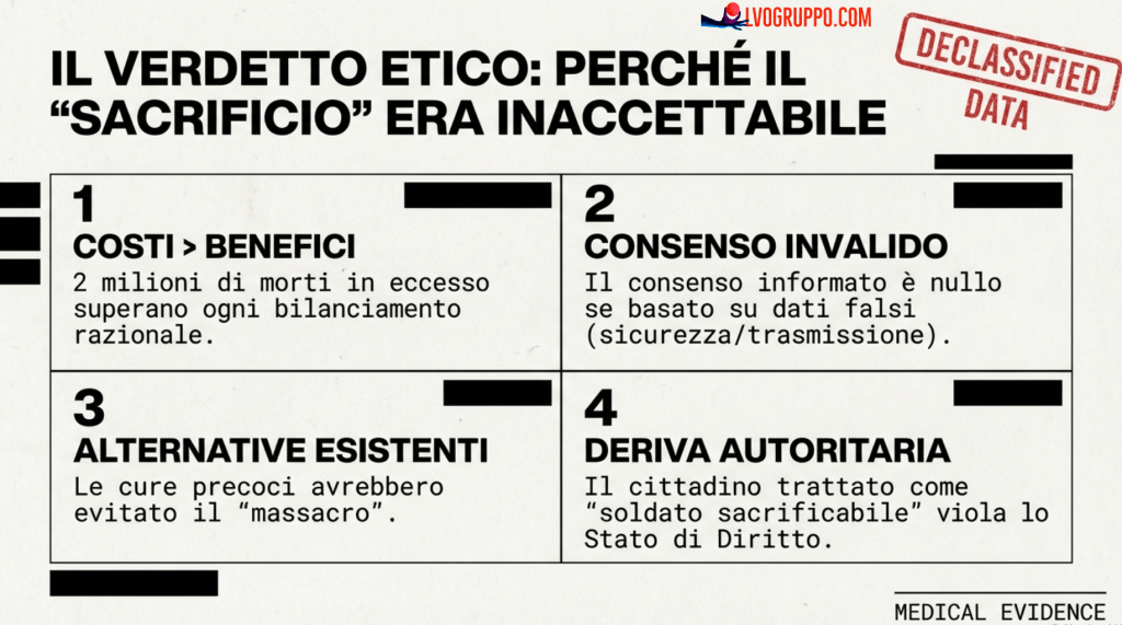 1. L’Entità delle Perdite: I dati sull’eccesso di mortalità globale (oltre 2 milioni di morti in eccesso nel 2021-2022) indicano che il numero dei “sacrificati” supera ogni bilanciamento razionale per un obiettivo sociale. Il costo umano è stato superiore al beneficio.