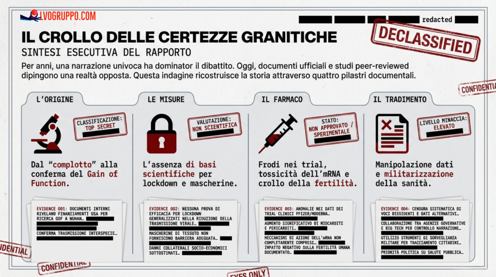 Oggi, però, il castello di certezze ufficiali sta mostrando crepe profonde. Lontano dai riflettori dei media tradizionali, una montagna di prove, studi scientifici e ammissioni istituzionali sta emergendo, dipingendo uno scenario radicalmente diverso. Questo documento ricostruisce cronologicamente gli eventi, intrecciando le evidenze scientifiche con le responsabilità istituzionali, basandosi esclusivamente su ricerche recenti, documenti ufficiali e ammissioni pubbliche.
