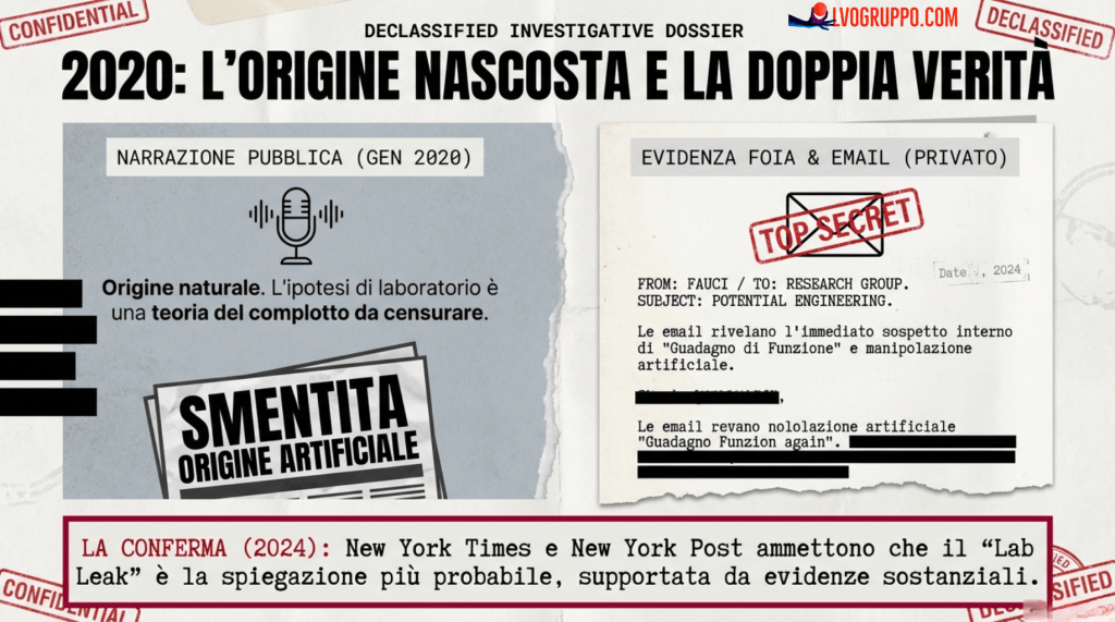 Nonostante questa consapevolezza interna, i documenti mostrano un coordinamento strategico volto a presentare l’origine naturale come l’unica opzione scientificamente valida, marginalizzando sistematicamente ogni voce dissenziente. Chi parlava di “lab leak” veniva immediatamente bollato come teorico del complotto, censurato sui social media e delegittimato dalla comunità scientifica mainstream.