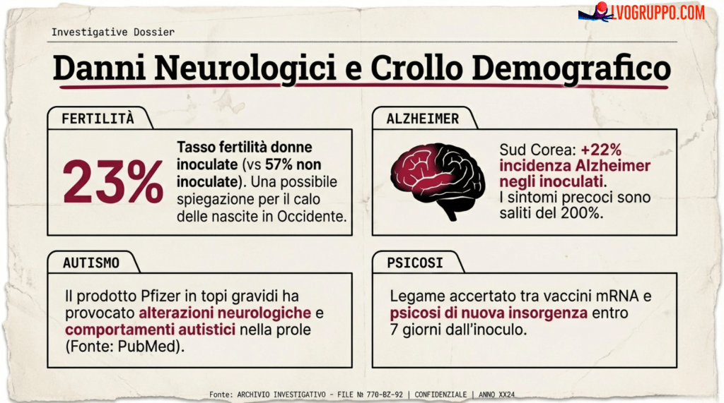 I dati sulla salute riproduttiva rivelano un divario drammatico: il tasso di fertilità nelle donne inoculate è risultato essere del 23%, contro il 57% delle non inoculate — un dimezzamento che fornisce una chiave di lettura clinica per il calo demografico che sta investendo i paesi occidentali.