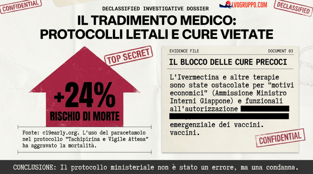 I dati dimostrano che questo protocollo non è stato solo inefficace, ma letale. L’analisi condotta da c19early.org ha rivelato che il paracetamolo ha aumentato il rischio di morte del 24% e di ospedalizzazione del 31%. Il protocollo del Ministero della Salute ha quindi attivamente aggravato la mortalità.