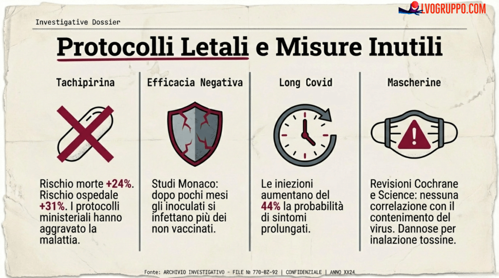 Mentre si imponevano lockdown e mascherine senza basi scientifiche, i protocolli terapeutici ministeriali rivelavano un’altra faccia della gestione pandemica. Il protocollo “Tachipirina e Vigile Attesa”, imposto in Italia e in molti altri paesi, prescriveva ai pazienti di rimanere a casa con paracetamolo e di recarsi in ospedale solo in caso di grave difficoltà respiratoria.