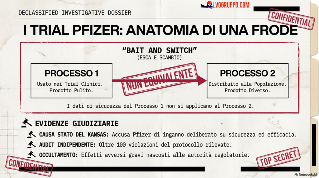 Mentre si celebrava la nuova tecnologia, analisi indipendenti dei trial autorizzativi di Pfizer stavano rivelando anomalie inquietanti. Un audit condotto da ricercatori indipendenti ha riscontrato oltre cento violazioni del protocollo, tra cui due così gravi da invalidare l’intero studio: