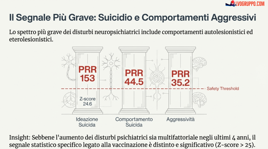 Questo valore indica che la segnalazione di depressione con ideazione suicidaria è 534 volte più frequente dopo vaccini COVID-19 rispetto ai vaccini influenzali. Un segnale di questa magnitudo non ha precedenti nella storia della farmacovigilanza vaccinale.